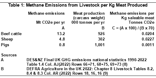 - See Table 1 in my post at https://economicdroplets.com/2024/12/07/a-correction-methane-emissions-from-uk-livestock/ Figures have been multiplied by 1,000 to convert from tonnes methane per kg saleable meat to kg methane per kg saleable meat.