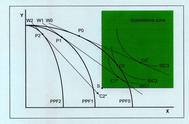 Since PPF0 passes through the subsistence zone, the country could initially subsist without trade, producing and consuming at point C0 where PPF0 touches the highest available indifference curve SIC2. If however it is able to trade, importing X and exporting Y on terms indicated by the slope of the world price line W0, it can produce at P0 but consume at C0*, achieving the higher welfare level SIC3 (an example of the gains from trade). This is important in the context that climate change and its effects are hard to predict with accuracy. Many approaches to mitigation and adaptation involve the certainty of incurring substantial costs but great uncertainty as to the benefits. By contrast, open trading involves little cost and yields benefits even if production is unaffected by climate change.