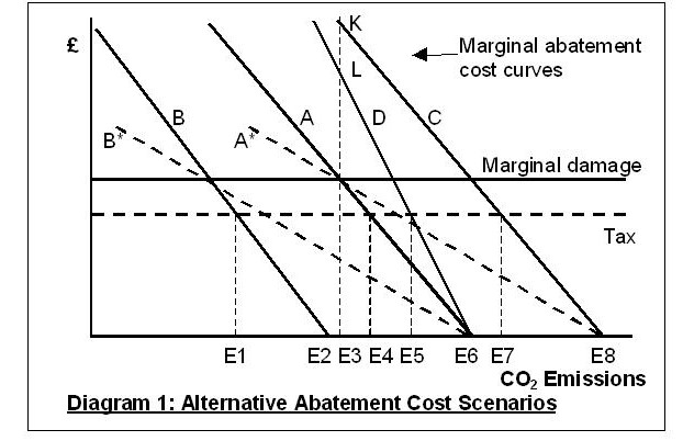 This post has been significantly edited. The original version conveyed the erroneous impression that the analysis in Diagram 2 helped to explain the slope of the marginal abatement cost in Diagram 1. This impression has now been removed.