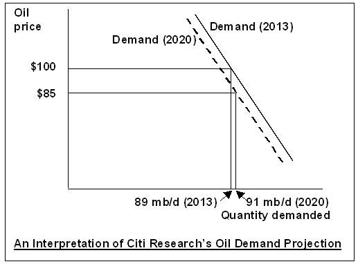 But then I noticed that Citi Research also predict a fall in oil prices from their current $100 per barrel to $80 – 90 by 2020 (6). A levelling-off of quantity demanded at a time when price is falling implies a fall in demand – a shift of the demand curve to the left (see diagram). This assumes, as most studies suggest, that oil demand is moderately price-elastic (7). If the price and quantity predictions are taken together, therefore, the implication is even more striking than the report’s title suggests: a fall in world oil demand over the period to 2020. In other words, the forces tending to reduce oil demand will more than offset those tending to increase it.