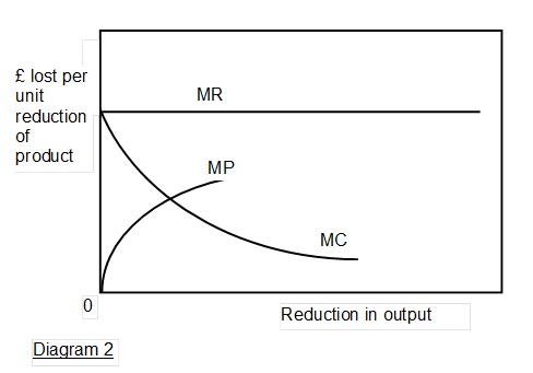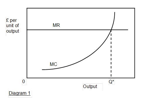 Diagram 1 shows, for a single-product firm, the conventional marginal revenue (MR) and marginal cost (MC) curves. It doesn’t matter for present purposes whether the firm is a price-taker (as shown) or has some degree of market power. The profit-maximising volume Q*. is at the intersection of the curves.