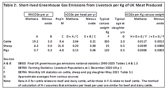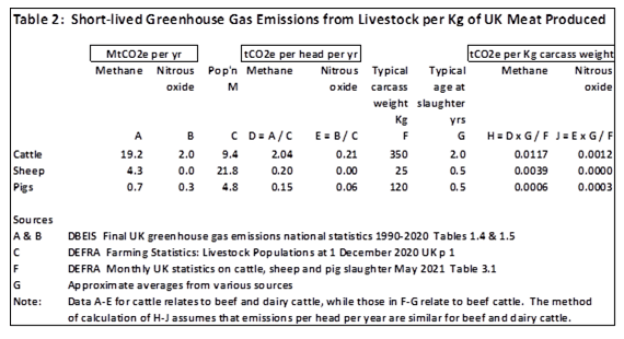 While the raising of livestock is strongly regulated in respect of animal welfare, the UK has no significant policies designed to reduce the methane emissions arising from the digestive process of ruminant animals including cattle and sheep. As Table 1 shows, this is the UK’s largest source of short-lived emissions. Comparing different forms of meat in terms of the methane emissions associated with production of one kilogram of meat, these are highest by far for beef, much lower for lamb, and much lower still for pork and chicken (pigs and chickens not being ruminants) – see Table 2 below. [Added 8 Dec 2024: Table 2 and the conclusions drawn from it contain significant errors. Please see this correction. Proposal 8 below is in need of review, which I hope to undertake in a future post. All other proposals in this post are unaffected. ] This is partly because beef cattle are typically slaughtered at around two years, as against about six months for sheep and pigs. While other greenhouse gases also need to be considered, especially nitrous oxide from livestock waste, the conclusion remains that beef cattle make by far the largest contribution of any livestock to climate change per kilogram of food produced. The contribution of dairy cattle is much less because of the very large quantity of milk that a dairy cow can yield over its lifetime.