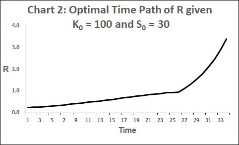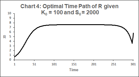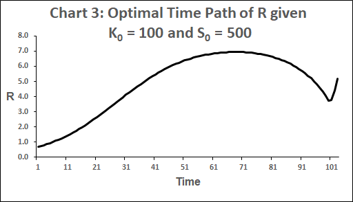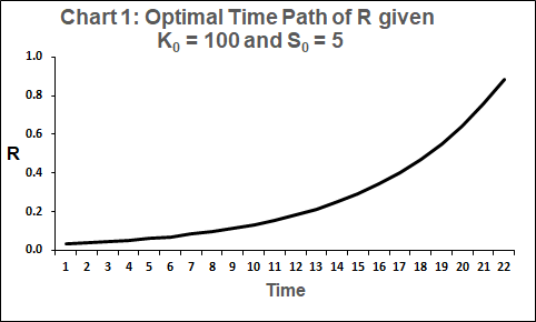 Suppose the inputs of a closed economy consist of produced capital K, a non-renewable resource R and labour L. It produces a single good which can be either consumed or added to the stock of produced capital. The quantity of output Y is determined by a constant-returns Cobb-Douglas function, implying in particular that if any one of K, R or L is nil then Y is nil. Technology is constant, as is labour input. Produced capital depreciates at a constant positive rate δK.